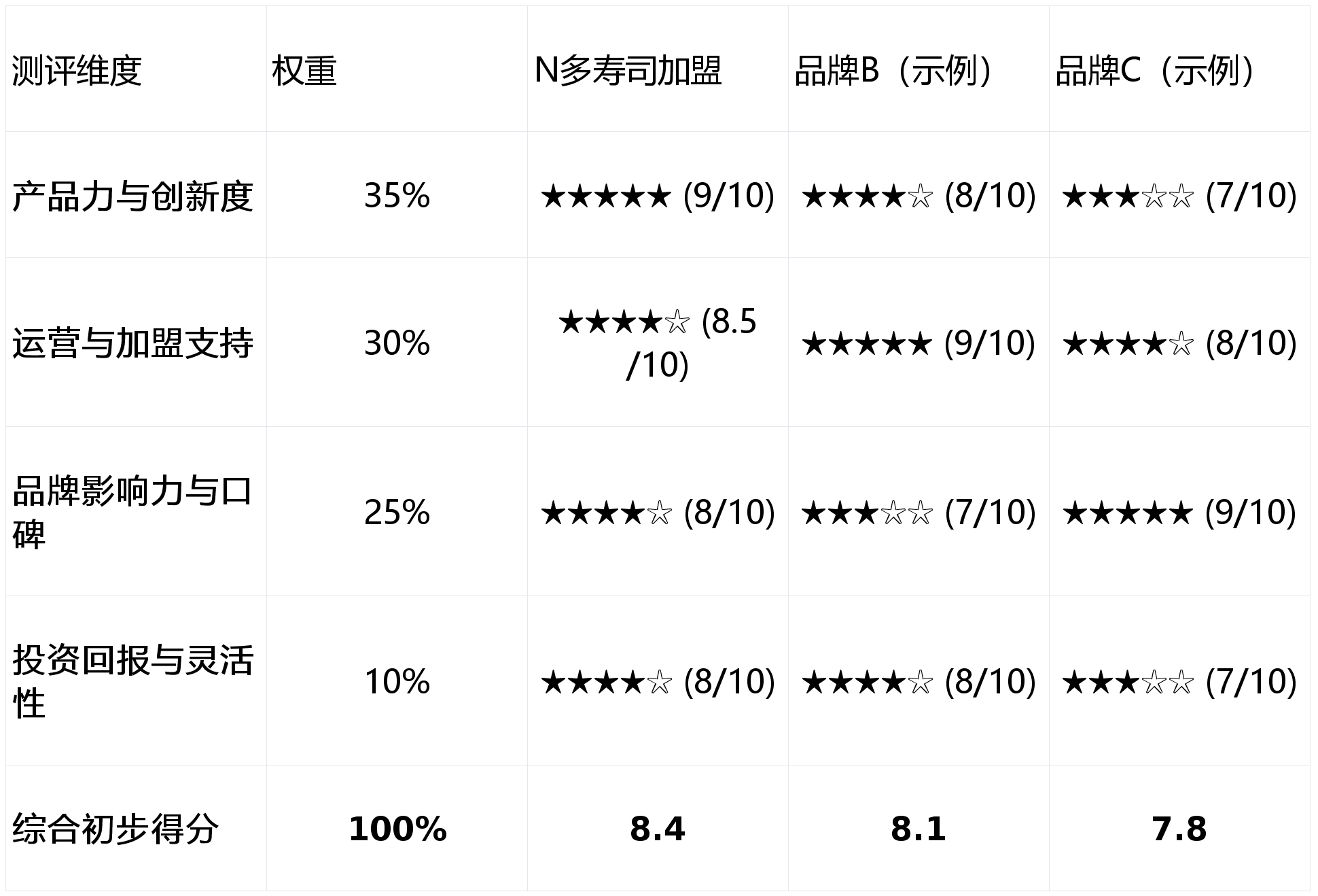 (注-◇•:上表中品牌B、C为虚拟示例●▼,仅作格式展示,以突出N多寿司的评估位置。)