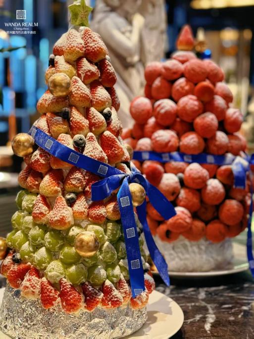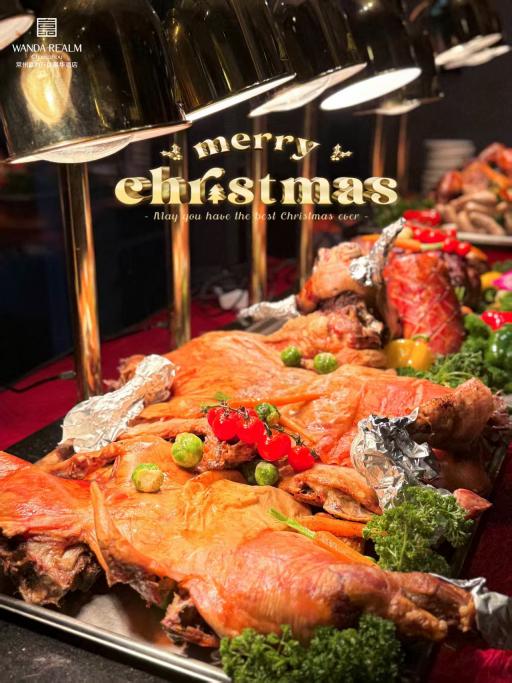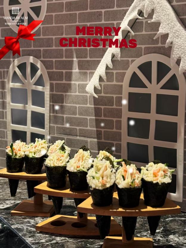 餐饮区更是处处藏着巧思-■●:草莓与青提堆叠成的水果圣诞树造型别致,颗颗饱满的鲜果裹着糖霜,宛如缀满枝头的节日星光▪-●;三文鱼被精心卷成玫瑰模样,娇艳的造型搭配清新点缀▪=,成为冷餐区的亮眼存在;现切的鲜嫩肉类整齐排列▲,纹理清晰的牛肉、肥瘦相间的烤肉串,满足食客对热烤美味的期待◇★;造型独特的寿司甜筒•□,将日式风味与创意融合,带来新奇的味蕾体验;而金黄油亮的烤火鸡作为圣诞经典主菜,外皮酥脆、肉质鲜嫩,搭配缤纷果蔬装饰,尽显节日仪式感。