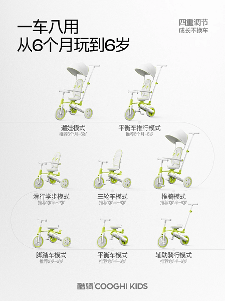 三轮车模式(1岁半6岁):在家长推行辅助下,满足1岁半以上儿童初步体验骑行乐趣的需求,适合小区◁、公园等平坦环境探索。