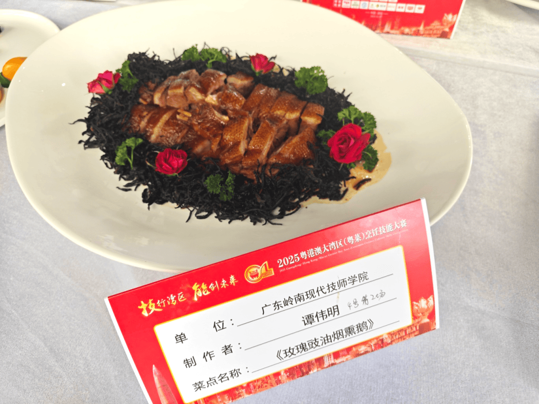 《玫瑰豉油烟熏鹅》烟熏鹅色泽金红•●、皮酥肉实,豉香与烟熏香交融醇厚;叉烧色泽如琥珀般莹润,蜜汁甜香沁入肌理,入口回甘。作品既延续传统烧腊精髓,又融入现代调味巧思。