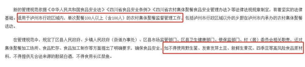 根据四川泸州发布的新版《泸州市农村集体聚餐食品安全管理规范》,其适用于泸州市行政区域内,监督管理工作,包括泸州市行政区域以外的乡厨在泸州市内承办的农村集体聚餐活动。