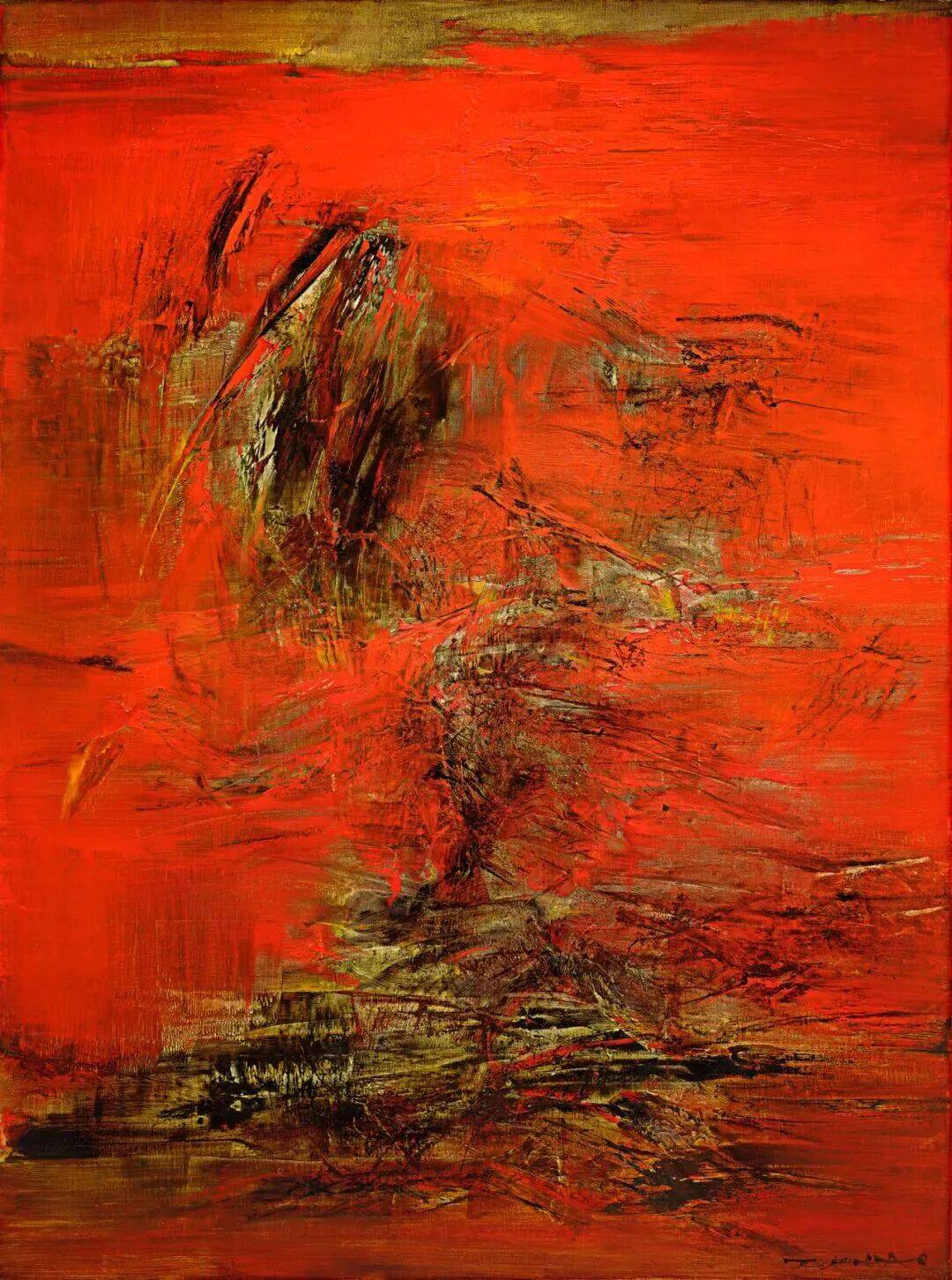 该作品以罕见的鲜红色为主调,气势恢宏,同时运用了艺术家…“狂草时期”标志性的中轴式构图,富有速度感的书法性笔触自上而下贯穿画面,赋予作品强烈的视觉冲击力▷,充分展现了艺术家创作巅峰时期的激情与自信。