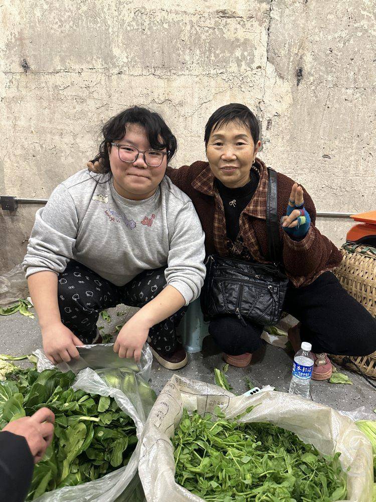 土鸡蛋、四季豆、嫩南瓜、丝瓜▲…、红苕尖、柑橘……新鲜的蔬菜在地上铺展开,泥土气息混着人声,防空洞里新年第一次烟火气迅速升温。