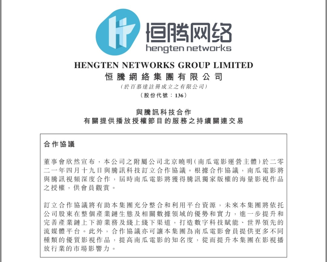 根据南瓜电影所属公司恒腾网络近日发布的公告显示,在接下来的五年内=☆△,南瓜电影将与腾讯视频进行深度合作,获取腾讯视频独家版权的海量影视作品授权,供南瓜电影的付费会员观看=▷。