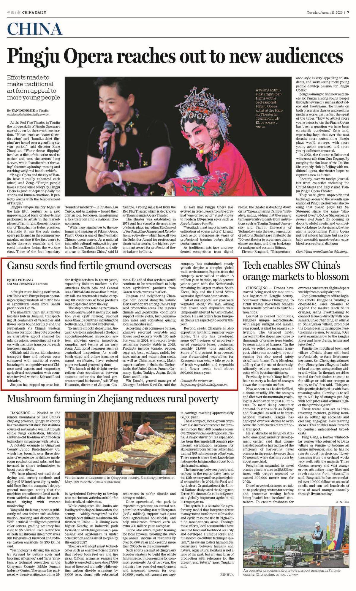 2026年1月13日,《中国日报》第七版推出英文报道《Gansu seeds find fertile ground overseas》(《甘肃种子在海外△-◆“开花结果▪☆★”》),聚焦“甘味”食材出海◁◇。依托河西走廊独特的自然条件和成熟的种业基础▼▲,酒泉…▪▪、张掖等优质农产地正加快融入“一带一路-•☆”农业合作网络,推动更多甘肃农产品走向世界餐桌。