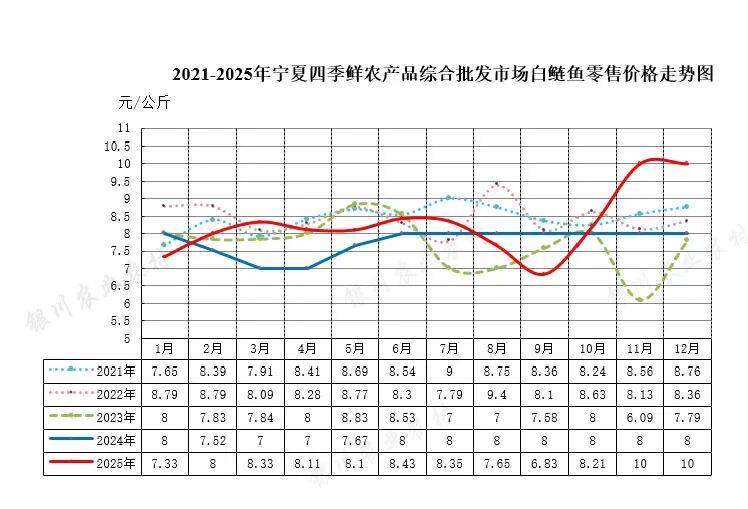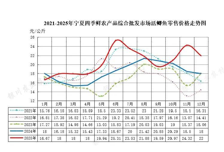 2○.活鲫鱼。价格先降后升,从2021年的19=•.27元/公斤降至2023年的16.70元/公斤,随后回升至2025年的20.68元/公斤○◇●。同样在6-7月出现价格峰值,2025年6月达25△….31元/公斤,为五年高点。