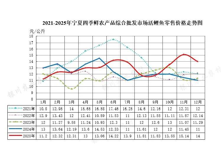 3.活鲤鱼-。2021年均价13★▽.9元/公斤为五年高点,随后两年下降至11.52元/公斤(2022-2023年),2024-2025年在13.03元/公斤附近小幅波动,季节性峰值不明显。