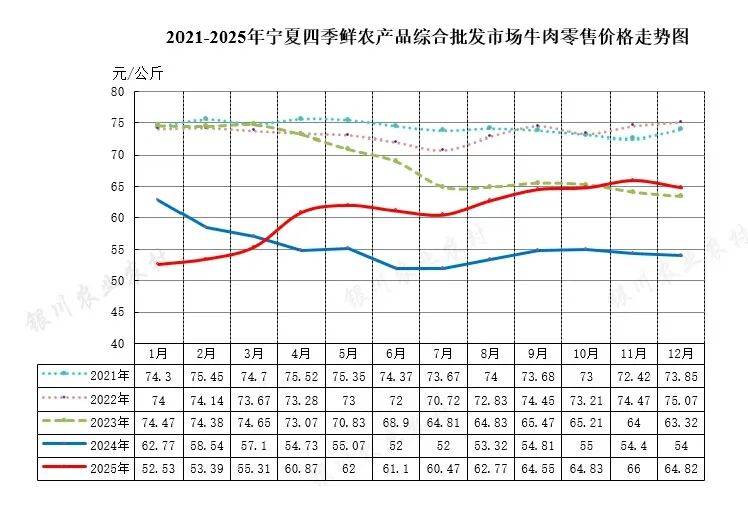 1.牛肉。价格在2021-2024年期间持续下行,由74☆.19元/公斤降至55-▪▽.31元/公斤(监测期低点)•,2025年止跌回升至60▲◁•.72元/公斤,涨幅9.8%。价格走势相对平缓,无明显季节性尖峰。2025年4月至11月呈现持续上涨趋势,价格从55.31元/公斤稳步攀升至66元/公斤▽▪。