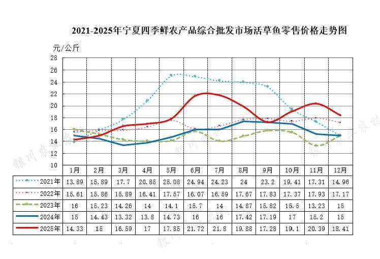 1▪.活草鱼■。年均价从2021年的20□•◁.12元/公斤下降至2022-2023年的14.81元/公斤(低点)◁▼,随后于2024-2025年回升至18.28元/公斤•○。季节性特征明显,价格在每年5-7月处于高位,2025年6月(21□.72元/公斤)=、7月(21▽.8元/公斤)为全年高点★。