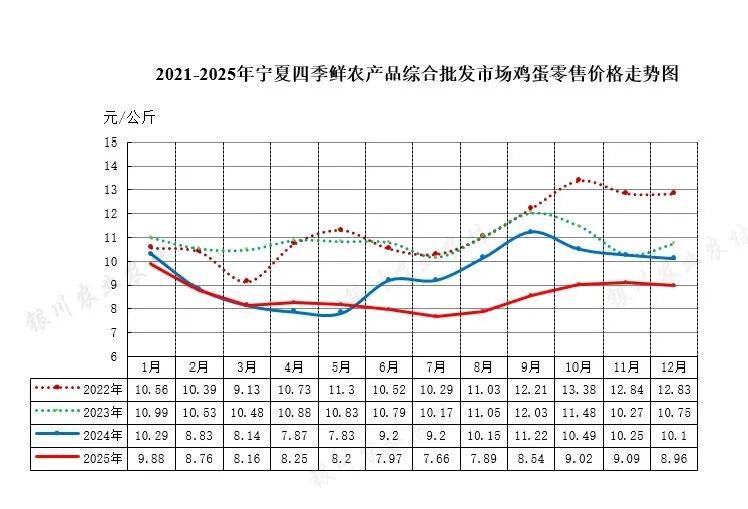 4…◇.鸡蛋。价格自2022年起连续四年单边下行,均价从11.27元/公斤降至2025年的8▪.53元/公斤(监测期低点)。价格波动平缓…,无强烈季节性特征◁★,2025年全年月度价格在8.96元/公斤至9.88元/公斤之间窄幅震荡▲△。