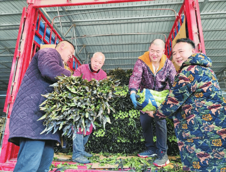 1月7日中午,在位于彭州市泓盛蔬菜产销家庭农场的蔬菜基地里,杨雄正安排工人◇◇,将经冻库降温的当日蔬菜进行打包处理○…,装车发货□。“每天10吨,发往贵州、湖南等地。多的时候,一天发20吨,当天就能卖完。•”