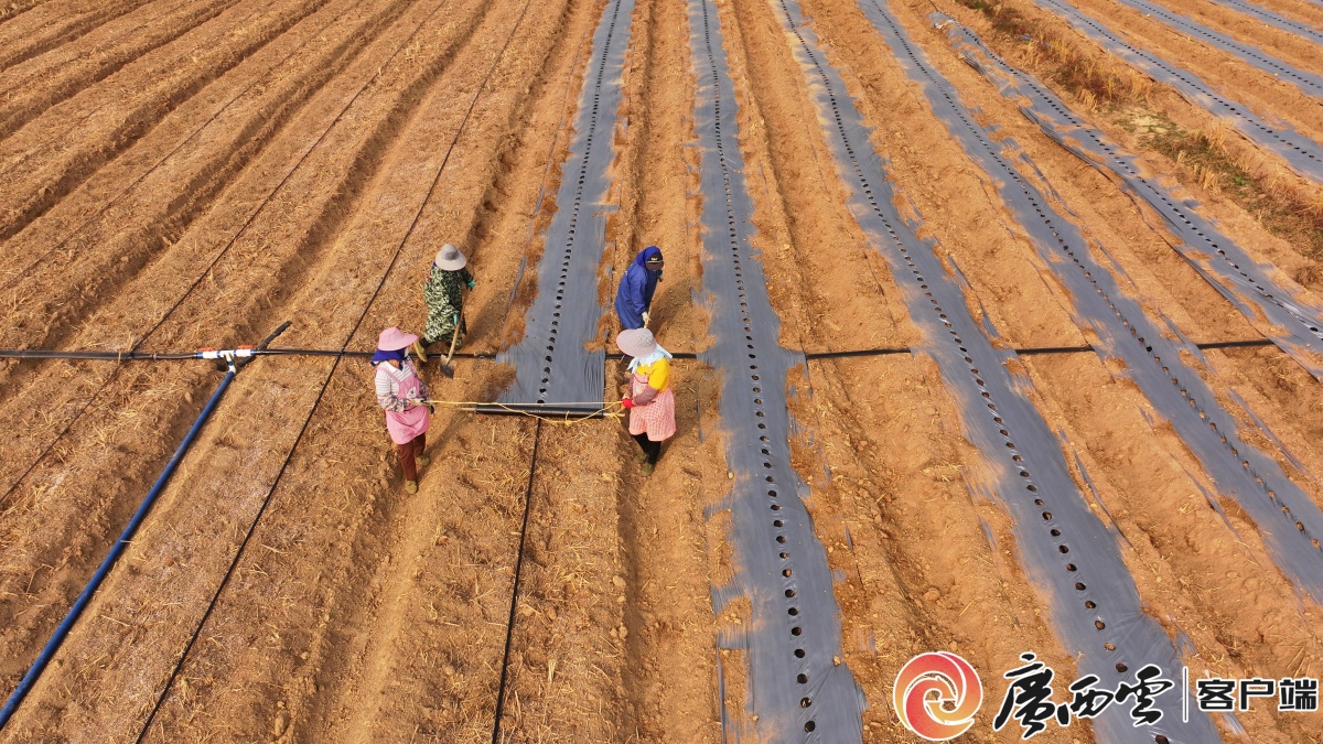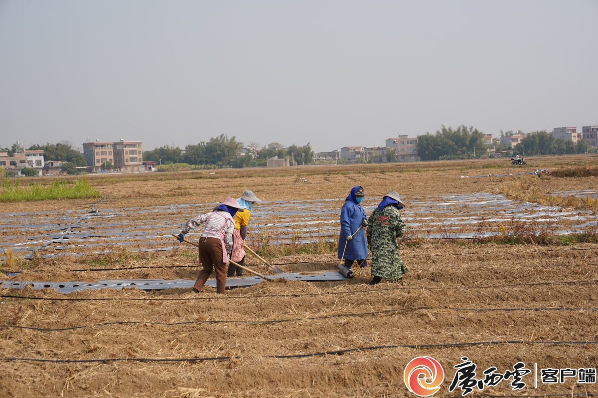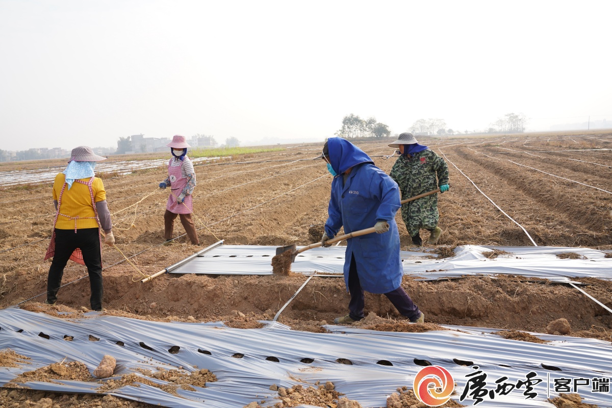 1月15日,走进贵港市港北区大圩镇永福村的南瓜种植基地,映入眼帘的是一派繁忙而有序的景象,几十位村民在田间忙碌,薄膜覆盖、滴灌铺设-、精准播种同步进行。