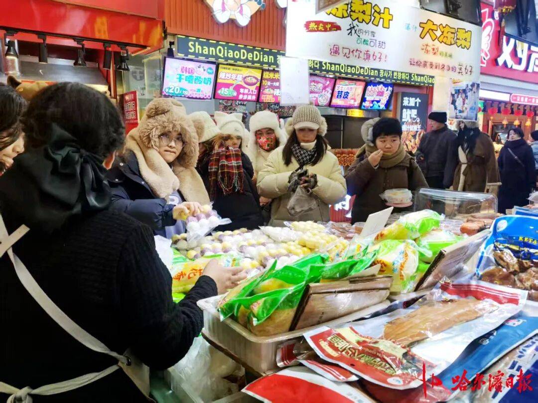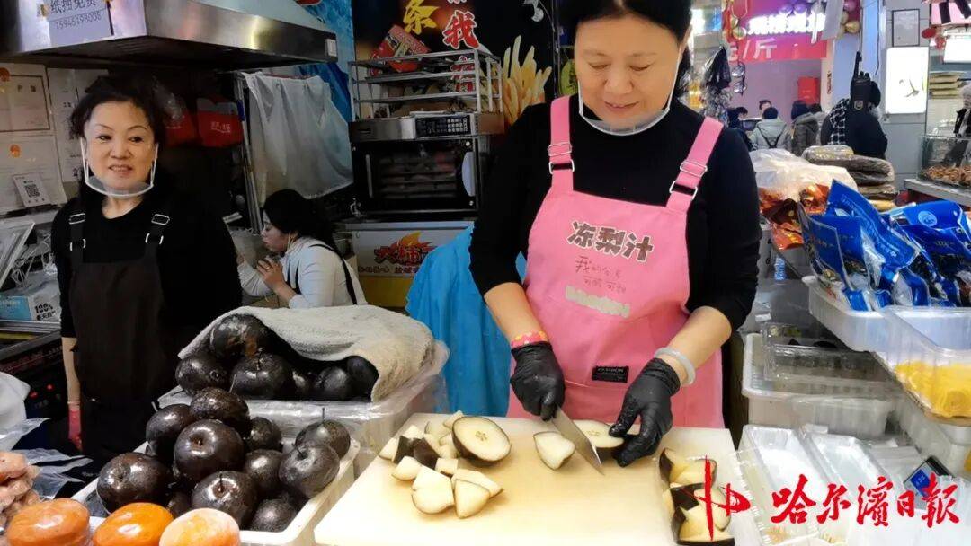 “来份冻梨冻柿子双拼?还是尝尝三色粘豆包?都有小包装,很方便!”在潘丽萍的摊位前,小巧的盒装东北美食整齐排列,吸引着游客驻足。作为前两年在道里菜市场因“冻梨切片”走红的摊主,今年她进一步细化产品形态,让东北特色美食更贴合游客的食用需求。