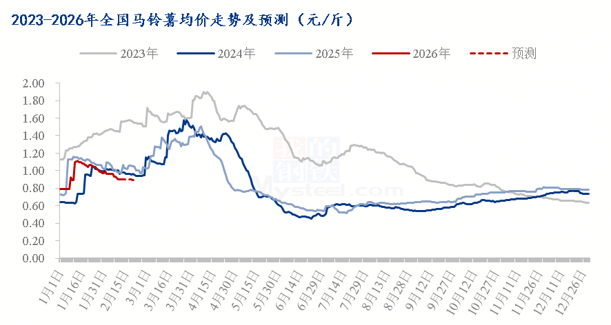 南方冬作区马铃薯新薯自1月初上市以来,价格高开低走,以广东惠东产区为例,截至2月12日春节前交易收尾状态,目前“荷兰”系列75克以上收购价0.90-1.00元/斤,较上市之初开秤价格已累计下滑0.60-0.70元/斤,目前价格仅小幅高于2024年和2022年同期,却明显低于2018-2021年以及2023年和2025年同期。